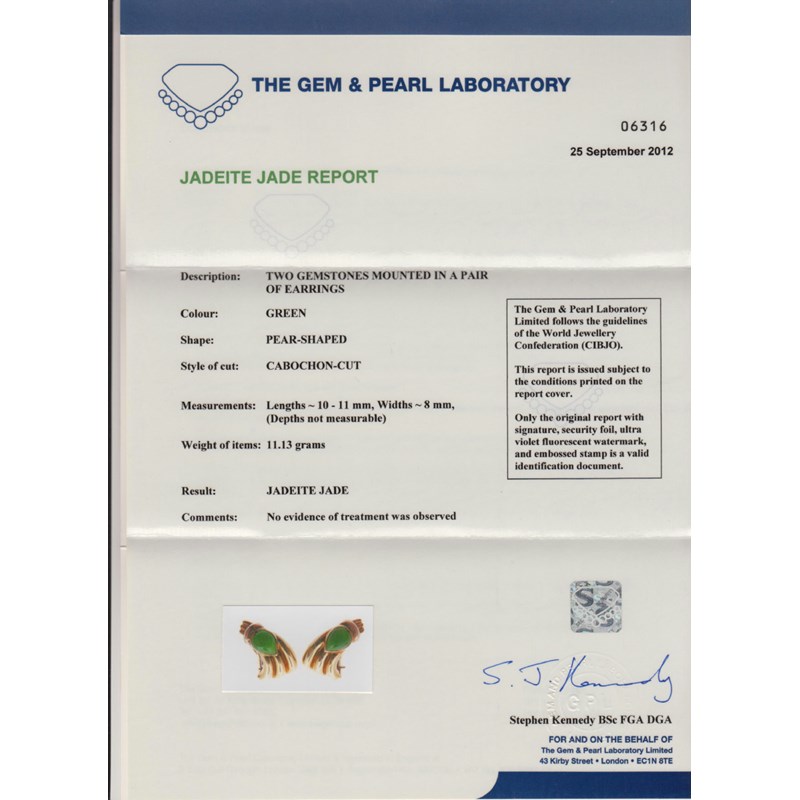 Accompanied by report number 06316 from The Gem and Pearl Laboratory, London dated 25th September 2012 stating that the pear-shaped jadeite jade cabochons measure 10 - 11mm x 8mm (depth not measurable). With no evidence of heat treatment observed.
