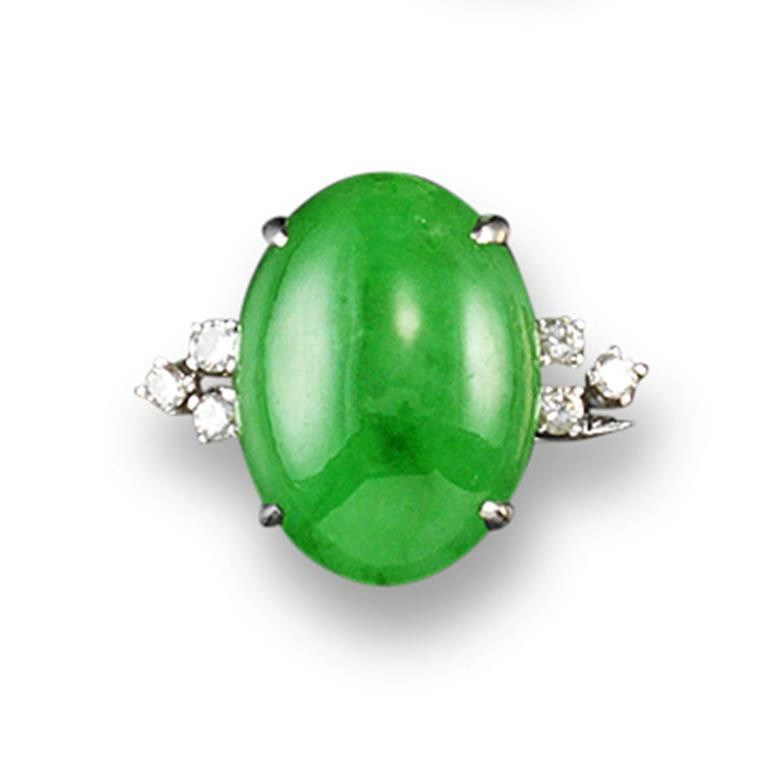A jade and diamond ring, the oval jade cabochon weighs is set with six small shoulder diamonds in platinum.