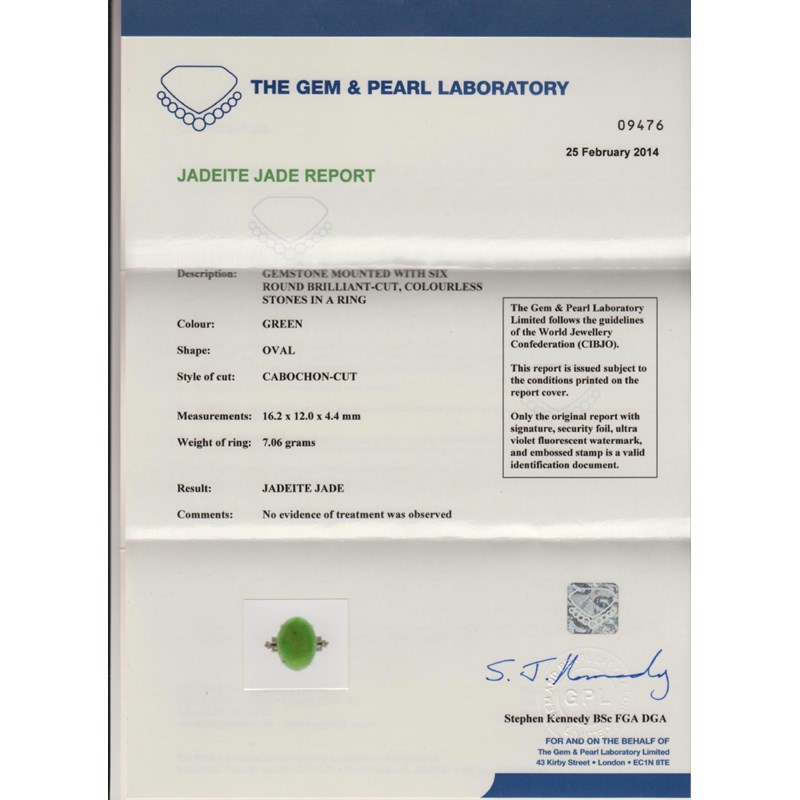 Accompanied by report number 09476 dated 24th February 2014 stating that the jadeite jade measures 16.2 x 12.0 x 4.4mm. With no evidence of treatment observed.