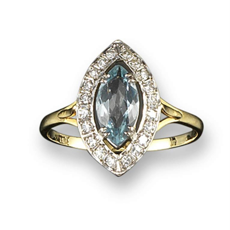 An aquamarine and diamond set navette shaped cluster ring, set in platinum and gold. Size Y.