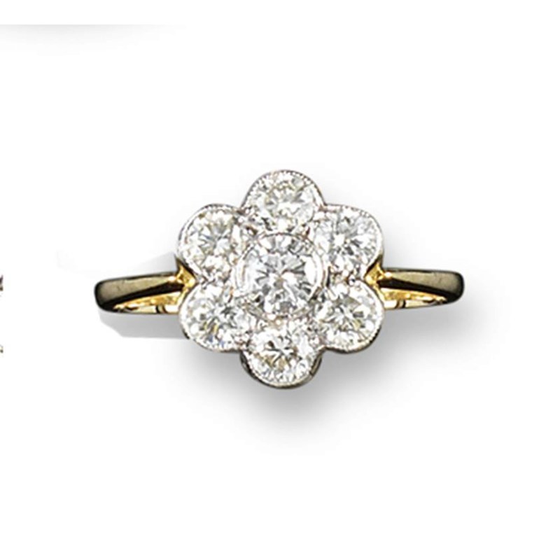 A diamond cluster ring, the seven circular cut diamonds weigh approximately 1.40cts in total. Size N 1/2.