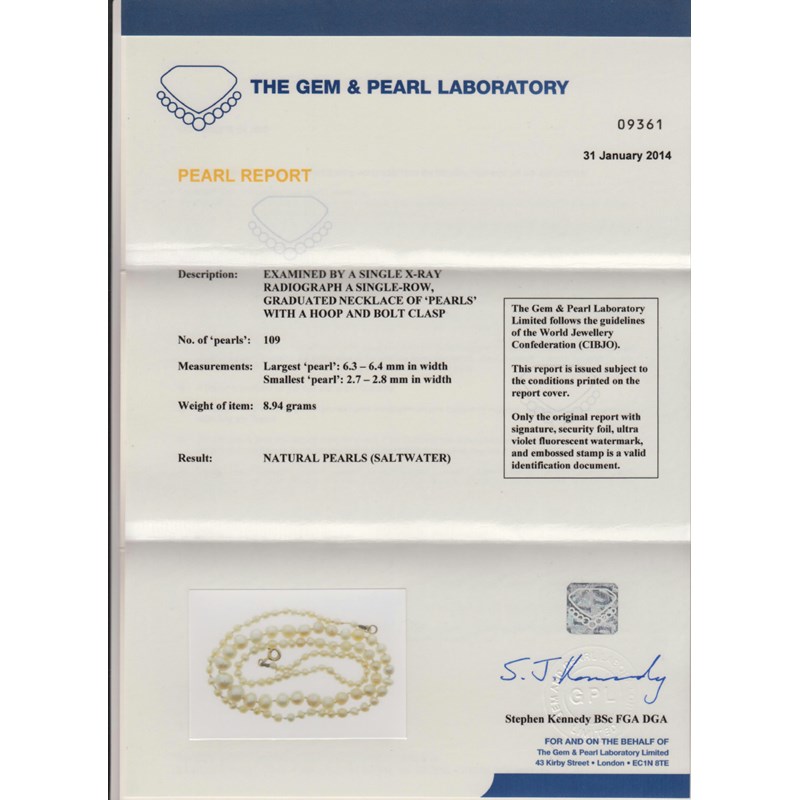 Accompanied by report number 09361 from The Gem and Pearl Laboratory, London dated 31st January 2014 stating that the 109 pearls measure 2.7 - 2.8 to 6.3 - 6.4mm, weighs 8.94g (including clasp) and are natural saltwater pearls.