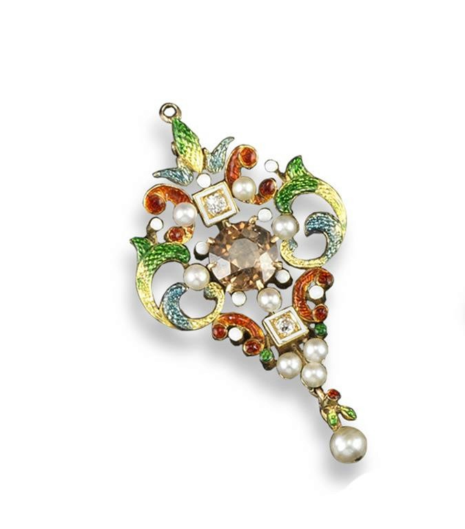 A Victorian shaded enamel and stone set scroll pendant, centred with a circular cut cinnamon coloured zircon, two diamonds and seed pearls in gold.