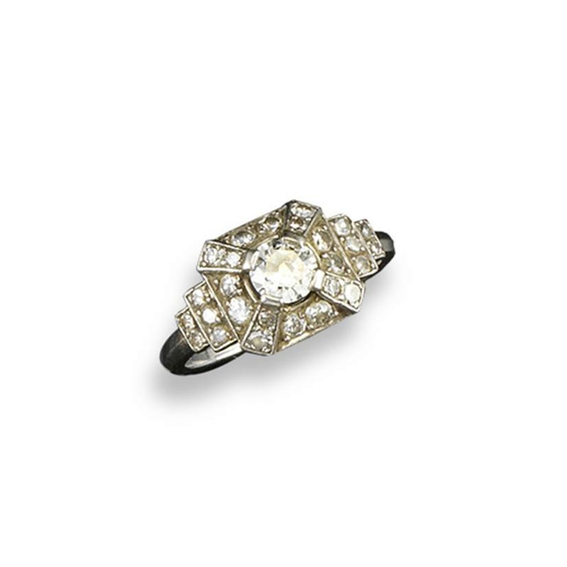 An Art Deco diamond cluster ring, the centre old circular cut diamond is set within a surround of smaller circular cut diamonds and a further ten shoulder diamonds in platinum. Size M 1/2.