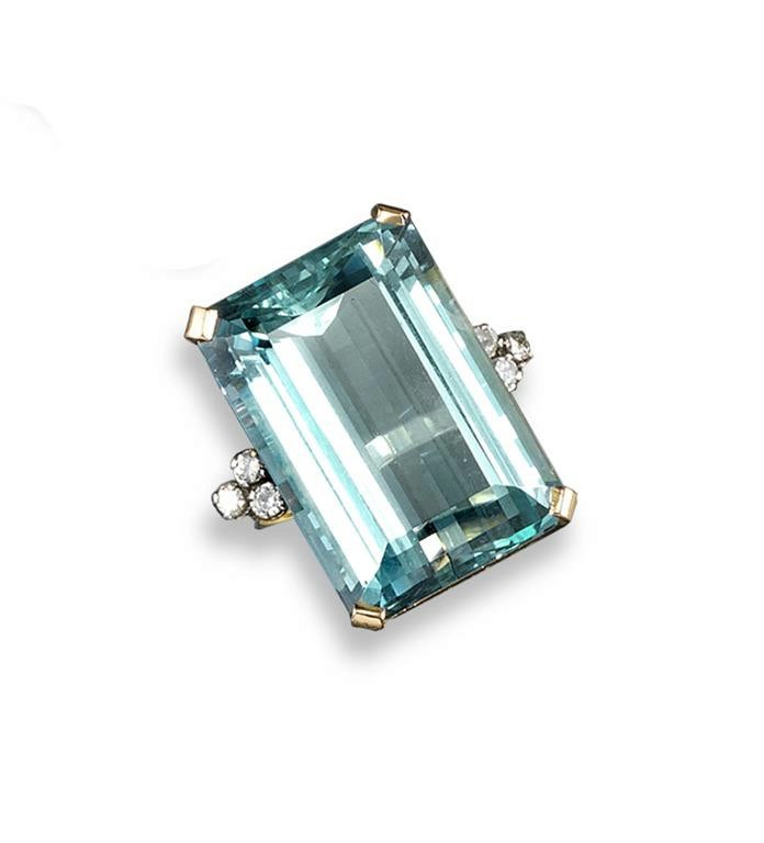 A large aquamarine and diamond ring, the emerald cut aquamarine weighs approximately 40.00cts and is set with three circular shoulder diamonds in carved and pierced yellow gold mount. Stamped 583 with a Kokoshnik. Approximately size I.