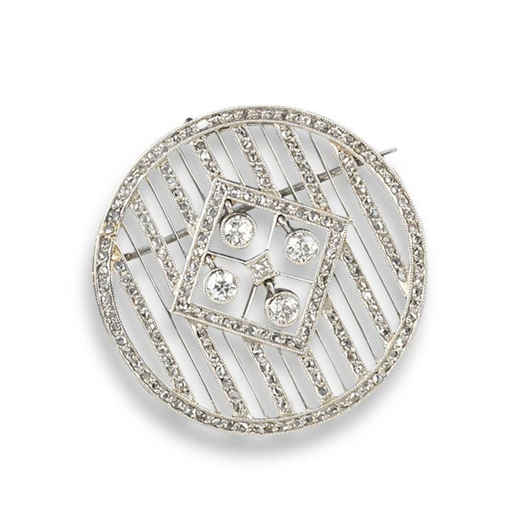 An Edwardian circular diamond set lattice brooch, the centre square section millegrain set with rose cut diamonds and suspending four larger circular cut diamonds. Further set with rose cut diamonds in platinum. 3.4cm wide.