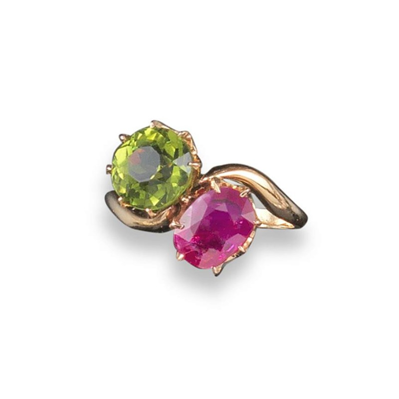 A ruby and peridot set gold cross-over ring, size L 1/2.