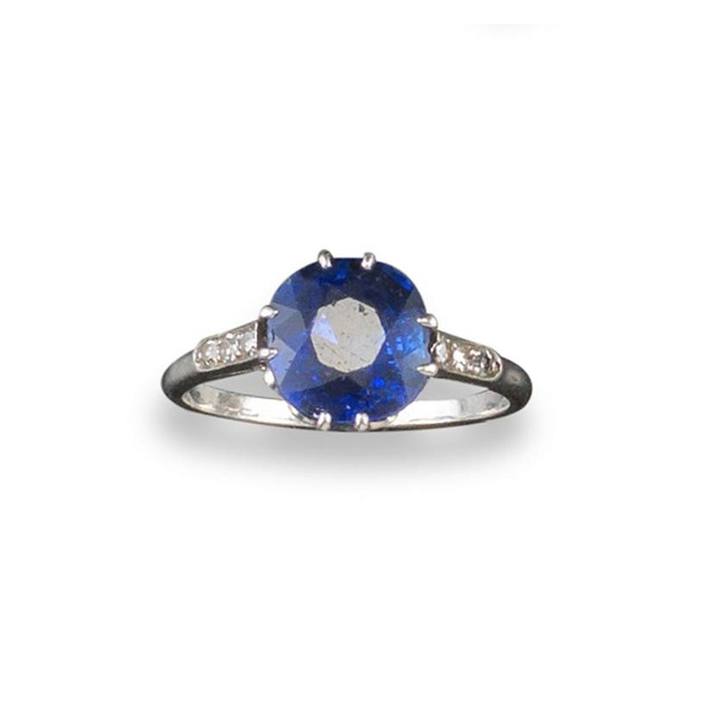 A circular cut sapphire and diamond ring, the sapphire is set with six small shoulder diamonds in platinum. Size O 1/2.