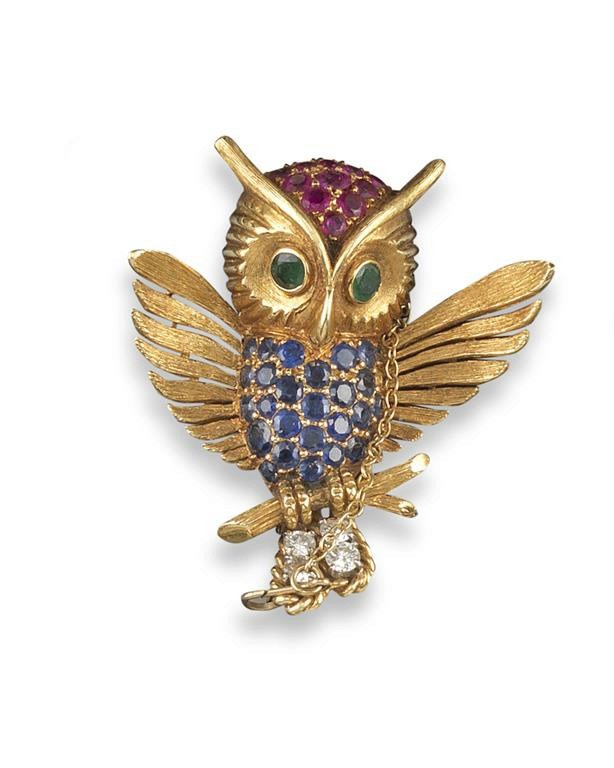 A gem set stylised owl brooch, set overall with diamonds sapphires, emeralds and rubies and with outstretched textured wings. 4cm high.