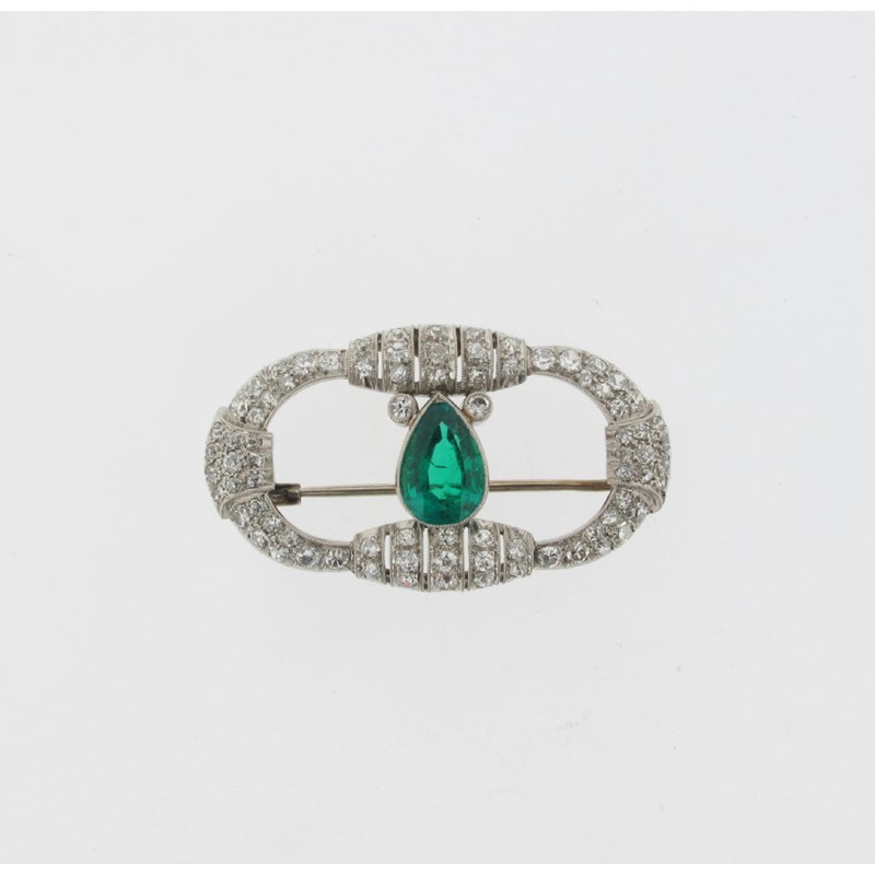 An emerald and diamond brooch, the pear shaped emerald is millegrain set with graduated diamonds to the ornate pierced frame. Marked with initials possible AFB and unidentified marks. 3.8cm wide.