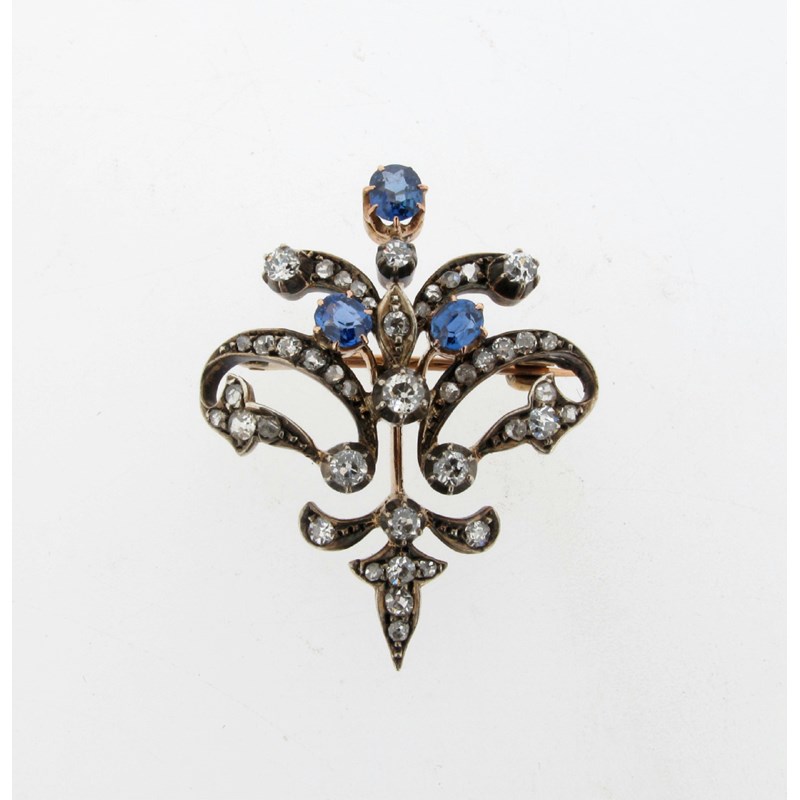 A late Victorian stylised foliate brooch, set with graduated circular cut diamonds and three sapphires in silver and gold. 3.5cm high.