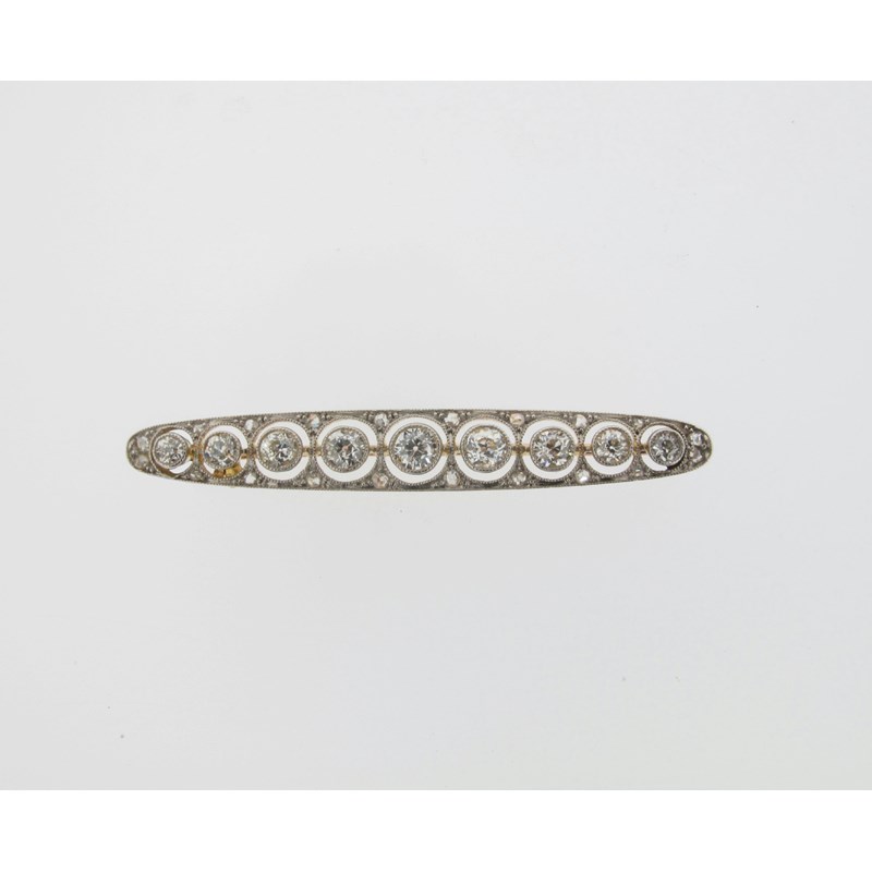 A diamond bar brooch, centred with a line of nine graduated circular cut diamonds millegrain set in platinum and gold with further rose cut border diamonds. Fitted case by Carrington.