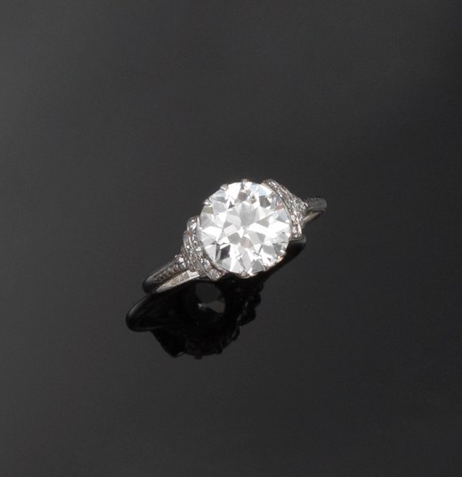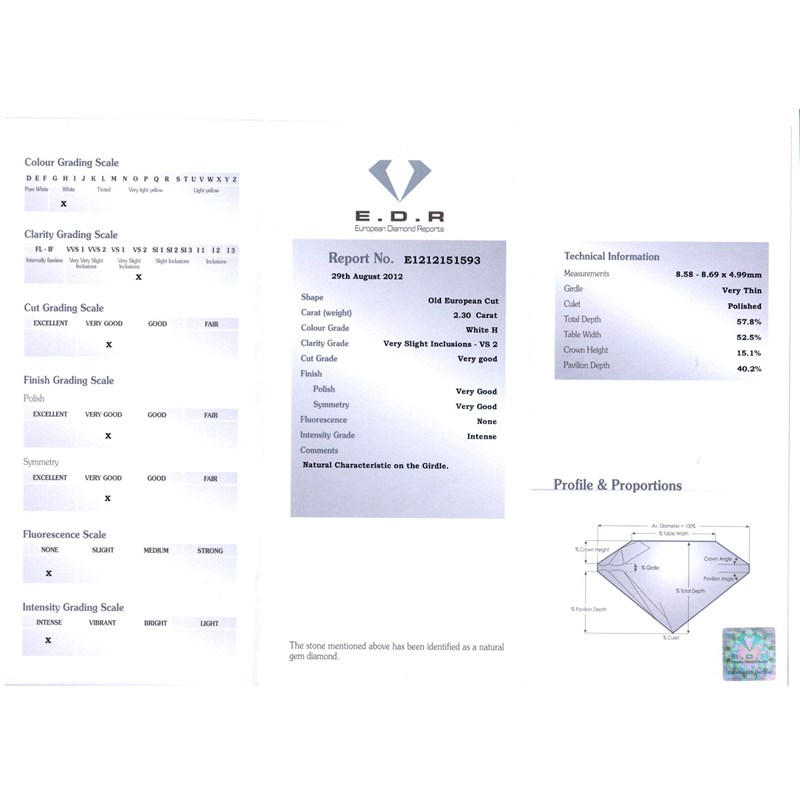 A diamond solitaire ring, the round old brilliant cut diamond weighs 2.30cts and is set in platinum with small diamonds set to the graduated shoulders and underbezel, engraved shank. Size N. Accompanied with certificate number E1212151593 from E.D.R dated 29th August 2012 stating that the diamond weighs 2.30cts with H colour and VS2 clarity.