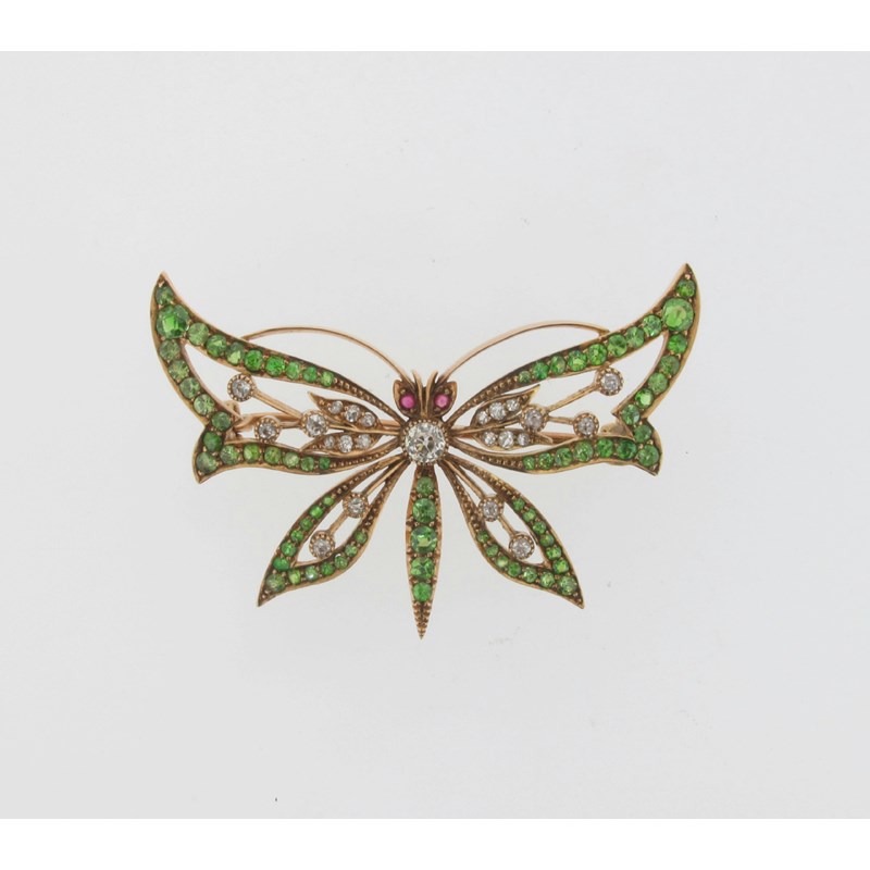 An Edwardian diamond and demantoid garnet set gold butterfly brooch, the openwork brooch set with graduated diamonds within borders of demantoid garnets. Cabochon ruby eyes. Set in gold. 4.5cm wide.