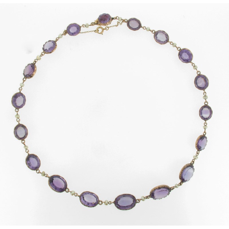 A Victorian amethyst riviere necklace, formed with graduated oval shaped amethysts in cut down collet gold mounts and each separated with a seed pearl. 46cm.