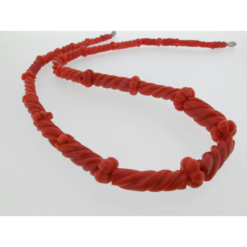 A graduated carved coral necklace, each cylindrical section is carved with swirl fluting and alternately mounted with foliate carved pieces.