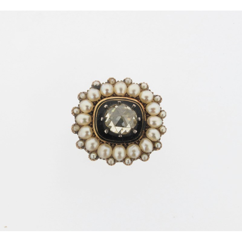 A George III mourning brooch, centred with a rose cut diamond on black enamel ground within two gold borders, with further surrounds of graduated pearls on gold. 2.2cm wide.