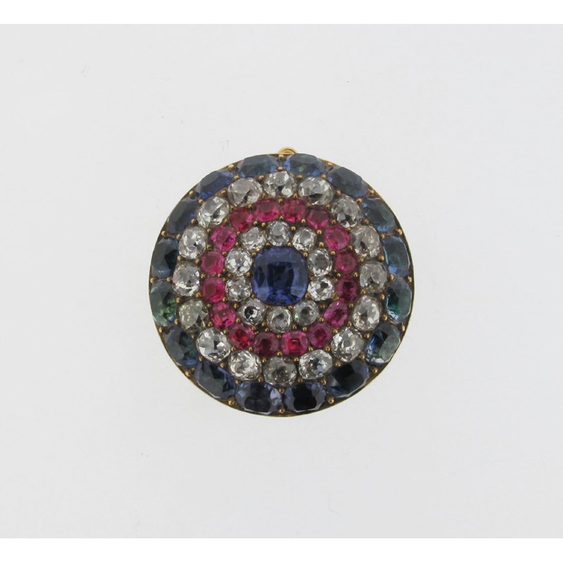 A 19th Century sapphire diamond and ruby target brooch, centred with a cushion shaped sapphire within a surround of diamonds, rubies, further diamonds and a border of sapphires in gold. 2.7cm wide.