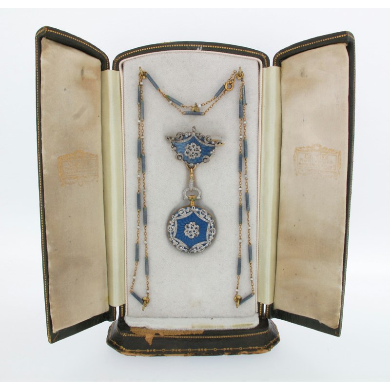 An early 20th Century open faced fob watch, the gold dial with black Arabic numerals and subsidiary seconds dial and blue guilloche enamel decoration to the bezel and reverse and applied with scroll designs set with small diamonds, suspended from a gold brooch with similar diamond and enamel decoration with a gold neck chain mounted with seed pearls and blue enamel cylinder links. The inner case signed Oscar Fresard and numbered 48175. The chain 32cm long with an associated Cartier box.