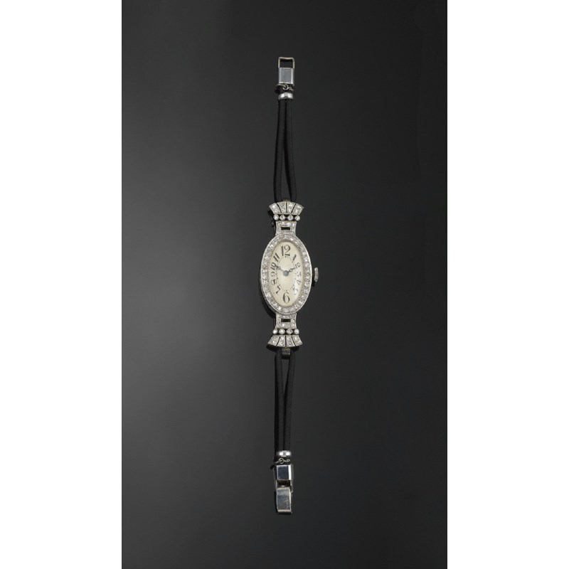 A ladies diamond set dress wristwatch, the plain oval dial with black graduated Arabic numerals, the movement signed Vertex W Co. Platinum case. Diamond set bezel and stylised palmette shoulder. Black chord band. Loose glass.