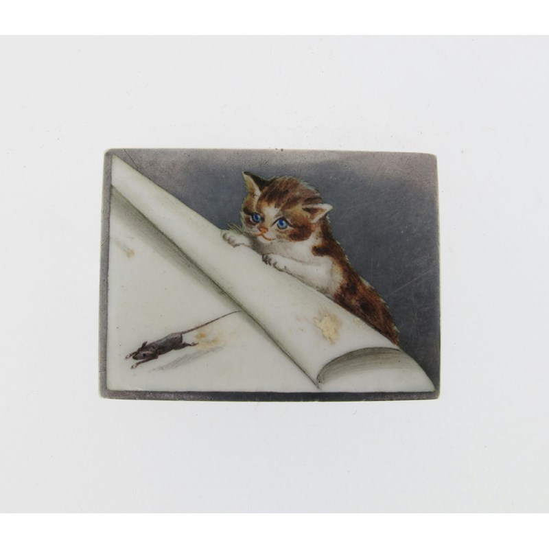 A late Victorian silver novelty brooch, depicting a kitten observing a running mouse. 3.6cm wide.