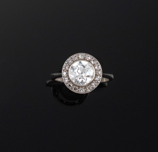 A diamond cluster ring, the old circular brilliant cut diamond weighs approximately 1.30cts and is set within a surround of small circular cut diamonds in platinum. The shank numbered 063935 size I.