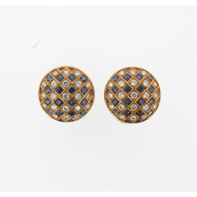 A pair of diamond and sapphire set gold earrings, of circular chequerboard form. Signed with initial W. Fitted case by Bruford.