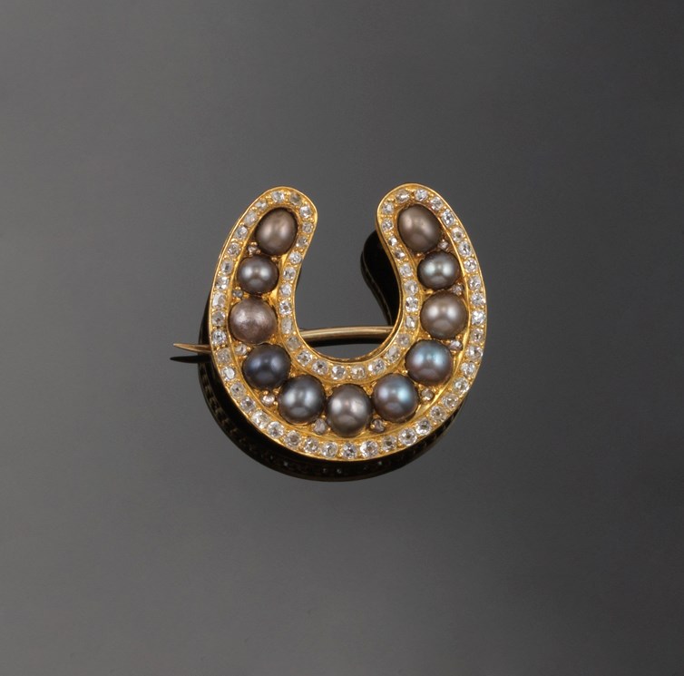 A Victorian gold horseshoe brooch, set with half black pearls within small cushion shaped diamond borders. Fitted case.
