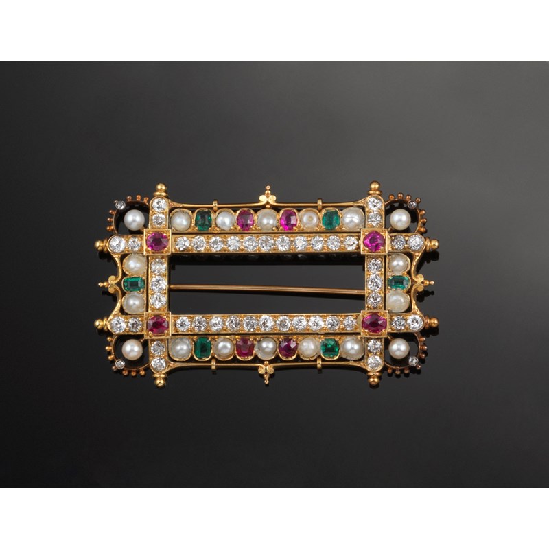 A Victorian gem set stylised rectangular gold buckle brooch, set with old circular cut diamonds within borders of rubies, pearls and emeralds, 5.5cm wide.