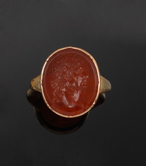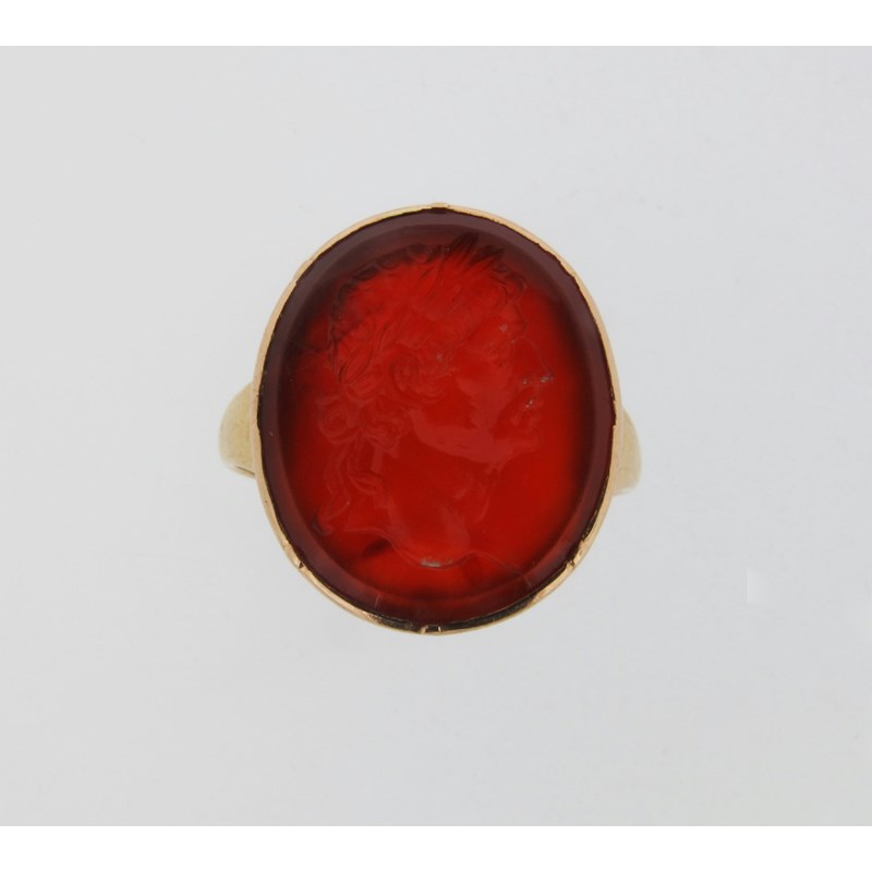 A carnelean intaglio ring, carved with the profile of a Roman emperor and mounted in gold. The intaglio 1.9cm high. Gold mount. Size P.