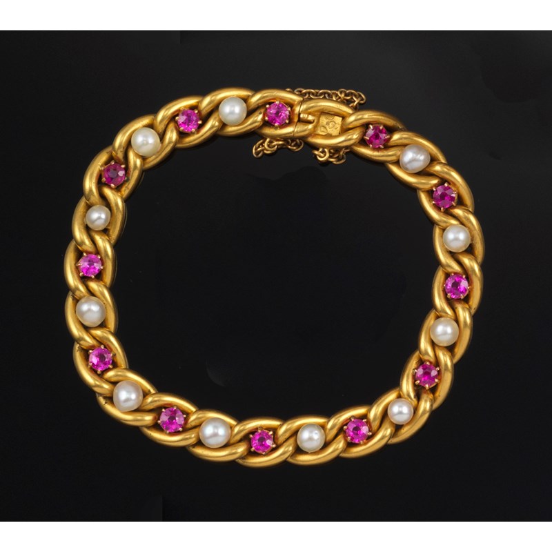 A French gold curb link bracelet, the frosted links alternately mounted with pearls and circular cut rubies. 22g.