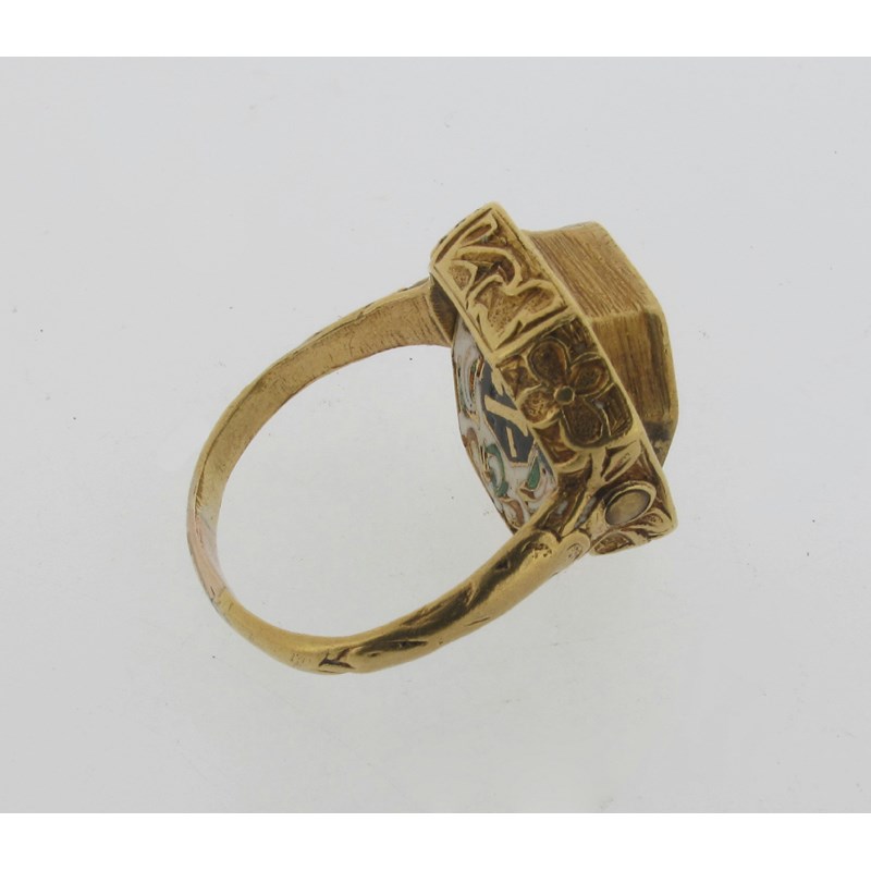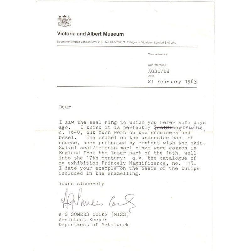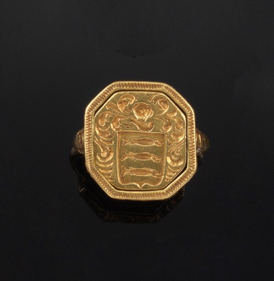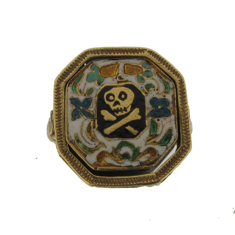 A Charles I double sided swivel memento mori gold seal ring, one of the octagonal sides engraved with arms, three horizontal fish beneath a helm and scrolling border, the other side centred with a scull and crossbones on black enamel ground within white enamel border containing flowers, possibly including daffodils. The gallery chased with assorted flowers possibly including daffodils and tulips with the remains of enamel decoration. Worn shank. The head 1.9cm high. 14g. Size P 1/2. With a letter from Miss Somers Cocks, assistant keeper of metalwork, Victoria & Albert Museum, 21st February 1983 in which she confirms the age of the ring and also refers to another revolving seal ring, number 115 in her exhibition Princely Magnificence. With Heraldry of Fish by Thomas Moule which lists and illustrates notices of the principle families bearing fish in their arms.