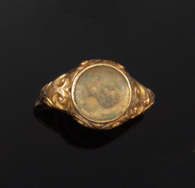 A gold memorial ring for the Duke of Wellington, the centre glazed circular section covers a relief profile of the Duke of Wellington. Scroll carved shoulders, glazed locket compartment to the reverse. Size I.