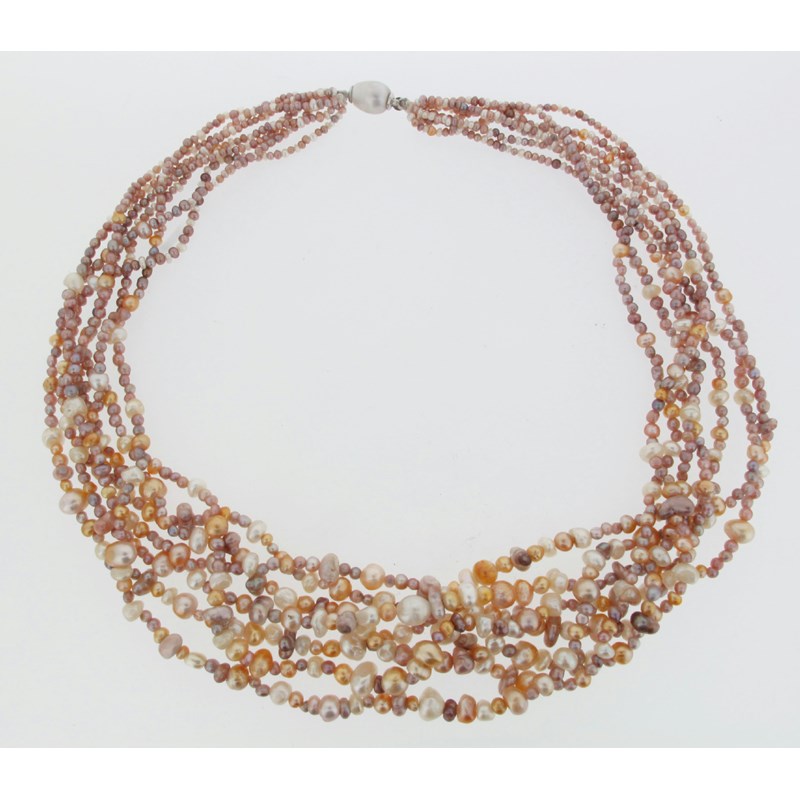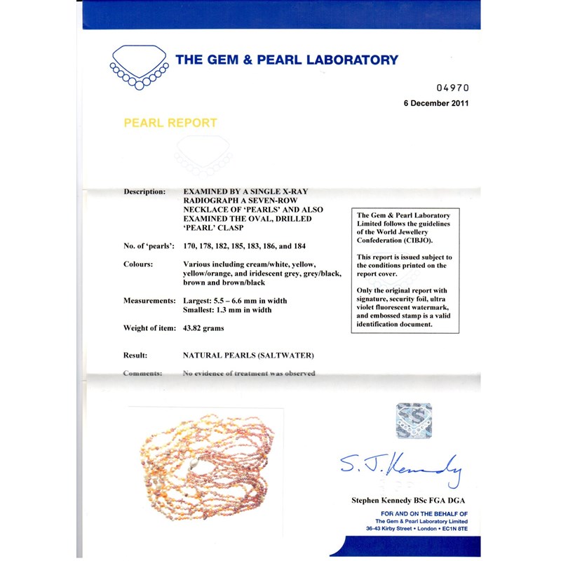 A seven row graduated pearl necklace, with gold mounted pearl clasp. 38cm. Accompanied with certificate number 04970 from The Gem and Pearl Laboratory dated 6th December 2011 stating that the various coloured pearls graduate from 1.3 - 5.5-6.6mm, weigh 43.82g (total) and are natural saltwater pearls.
