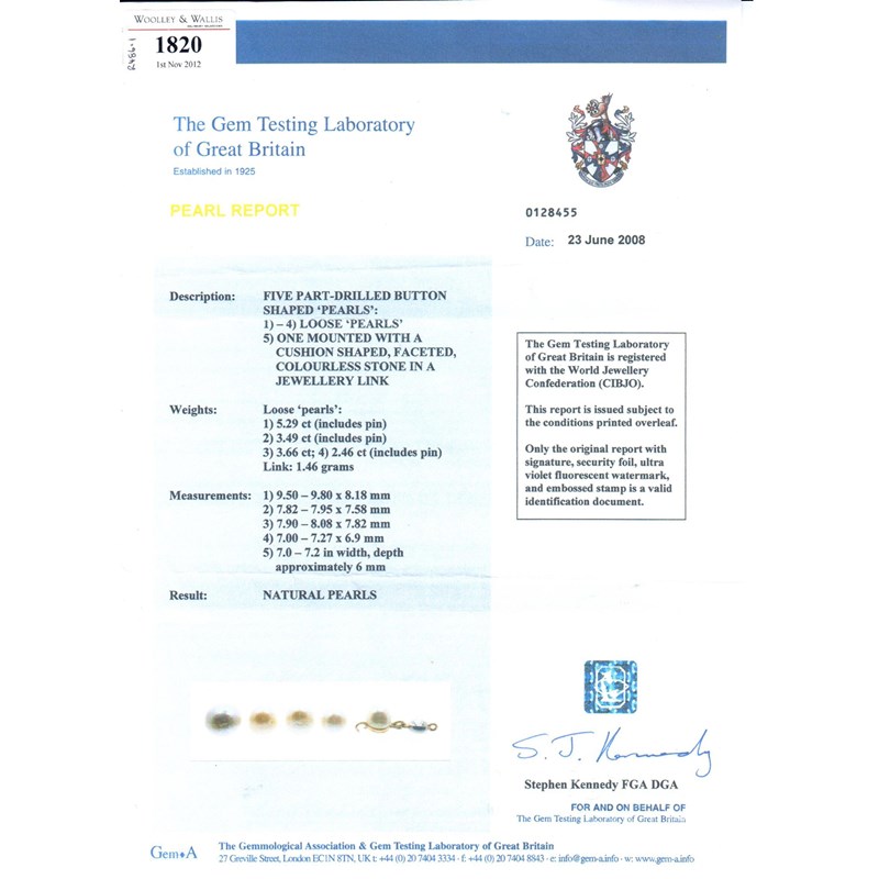 A pearl diamond and ruby bracelet, the five graduated pearls are set with eight circular cut diamonds and four oval shaped rubies in gold. 21cm long. Accompanied with a certificate from The Gem and Pearl Laboratory dated 23rd June 2008 stating that the five part-drilled button shaped pearls are natural.