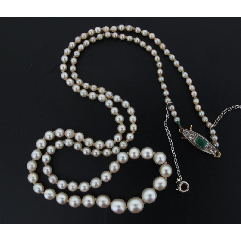 A single row graduated pearl necklace, the pearls graduate from 2.1 - 5.7mm with a navette shaped gold and platinum clasp set with an emerald and four diamonds, French control marks to the tongue. 47.5cm.
