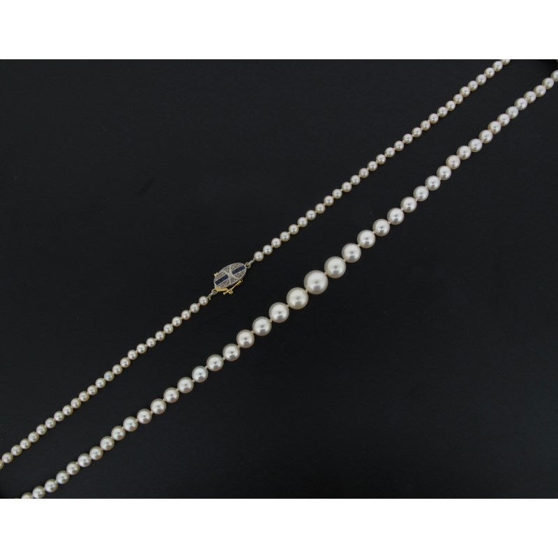 A single row graduated pearl necklace, 50cm. The small gold oval clasp set with calibre cut sapphires. Accompanied with certificate number 06030 from The Gem and Pearl Laboratory dated 20th July 2012 stating that the 119 pearls graduate from 2.7mm - 6.9mm, weigh 10.83g (total) are are natural saltwater pearls.