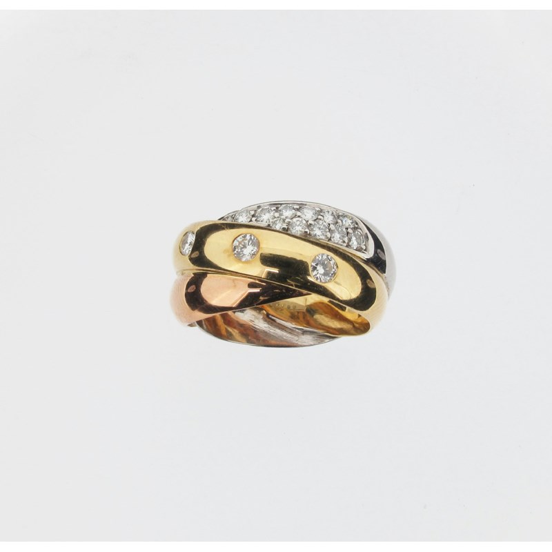 A three colour gold stylised Russian wedding ring, the pink gold section plain the yellow gold section pave set with three circular cut diamonds and the white gold section with twelve further graduated circular cut diamonds. Case by Boodles.