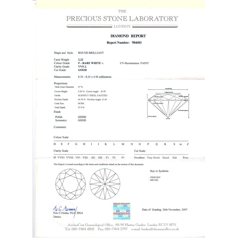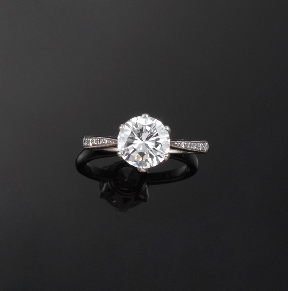 A diamond solitaire ring, the round brilliant cut diamond weighs approximately 2.22cts and is set in platinum with ten small graduated shoulder diamonds millegrain set in platinum. Size P. Accompanied with certificate number 984683 from The Precious Stone Laboratory, London dated 26th November 2007 stating that the diamond measures 8.50 - 8.65 x 4.96mm, weighs 2.22cts has F colour and VVS 2 clarity with faint fluorescence.
