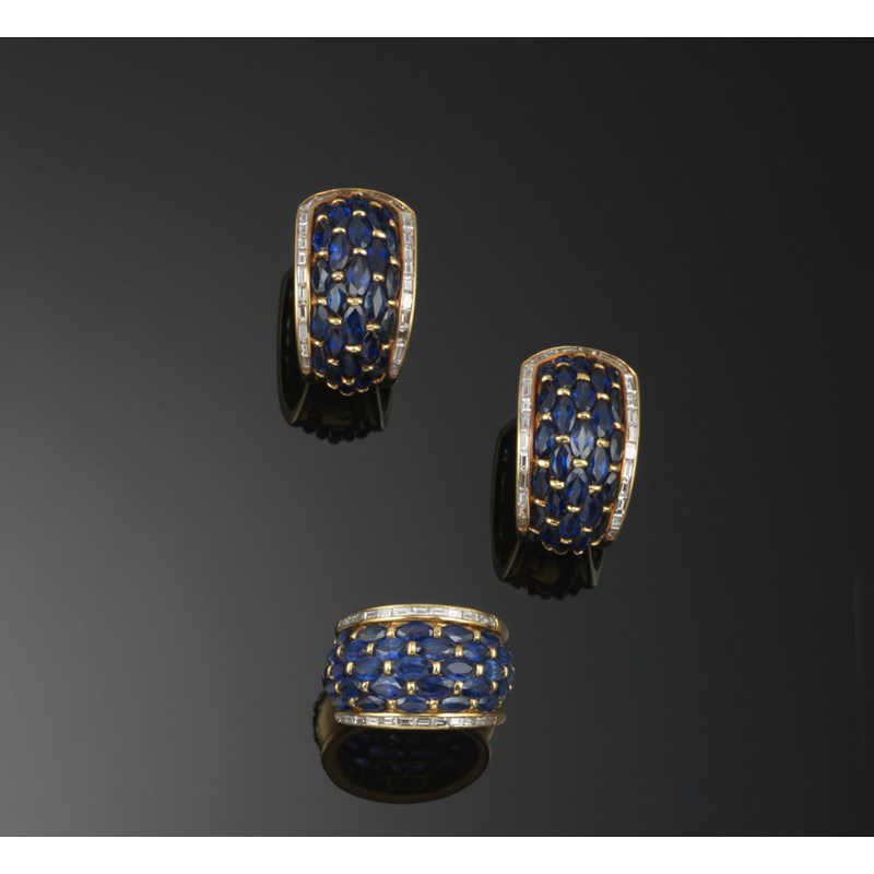 A French yellow gold ring with matching earrings, set overall with marquise shaped sapphires and baguette shaped diamonds.