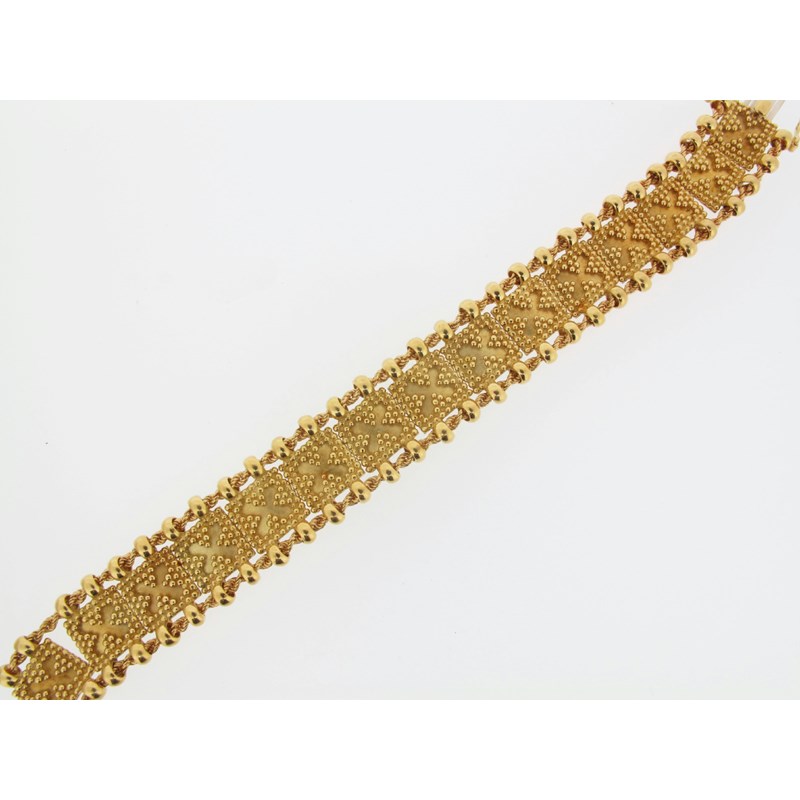 Elizabeth gage, an 18ct gold flexible section bracelet designed as a line of square panels each with granulated decoration. London marks and signed. 16.5cm. 58g. Cased by Elizabeth Gage.