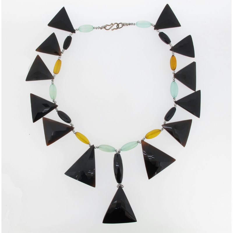 A striking Art Deco necklace, comprising geometric hardstone sections with small metal beads. 40cm.