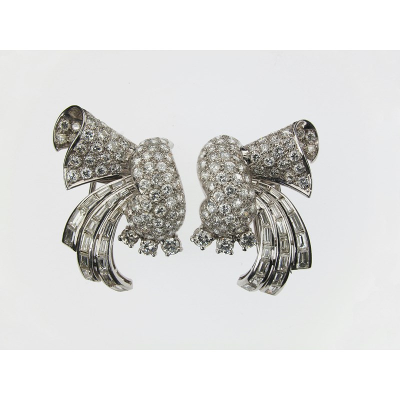 A pair of 1950s diamond set scroll brooches, each set with graduated round brilliant cut diamonds and three scrolls of baguette and tapered baguette diamonds in platinum.