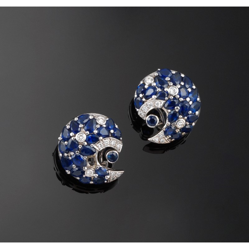 A pair of swirl earrings, pave set with round and pear shaped sapphires and circular cut diamonds in platinum. Clip fittings. 2.3cm wide.