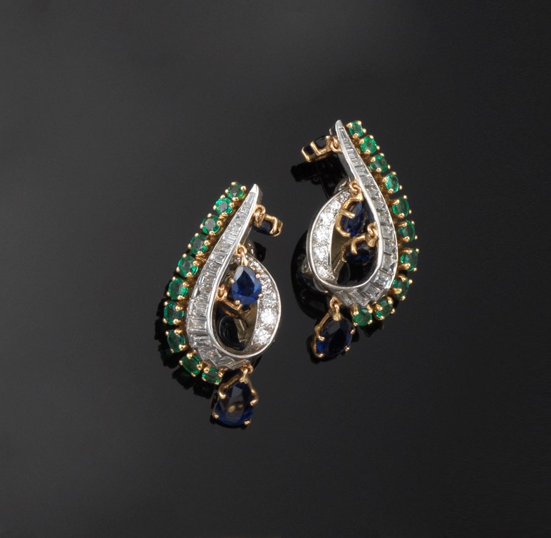 A pair of 1960s scroll earrings, set with baguette shaped and circular cut diamonds within a graduated circular cut emerald border. Suspending four graduated pear shaped sapphires and set in white and yellow gold. Each earring 3cm high.