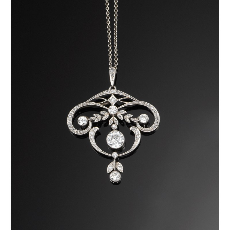 A Belle Epoque diamond pendant, set overall with graduated diamonds and with laurel decoration. The principle round old brilliant cut diamond weighs approximately 1.05cts, set in platinum and gold, on a fine link platinum neck chain.