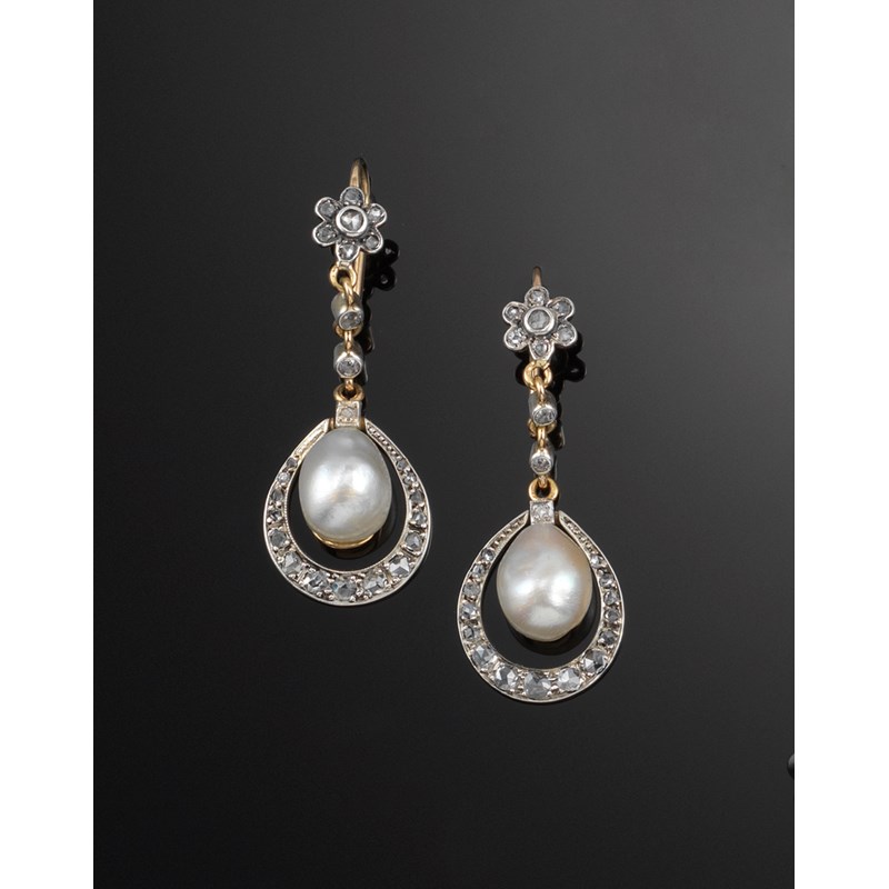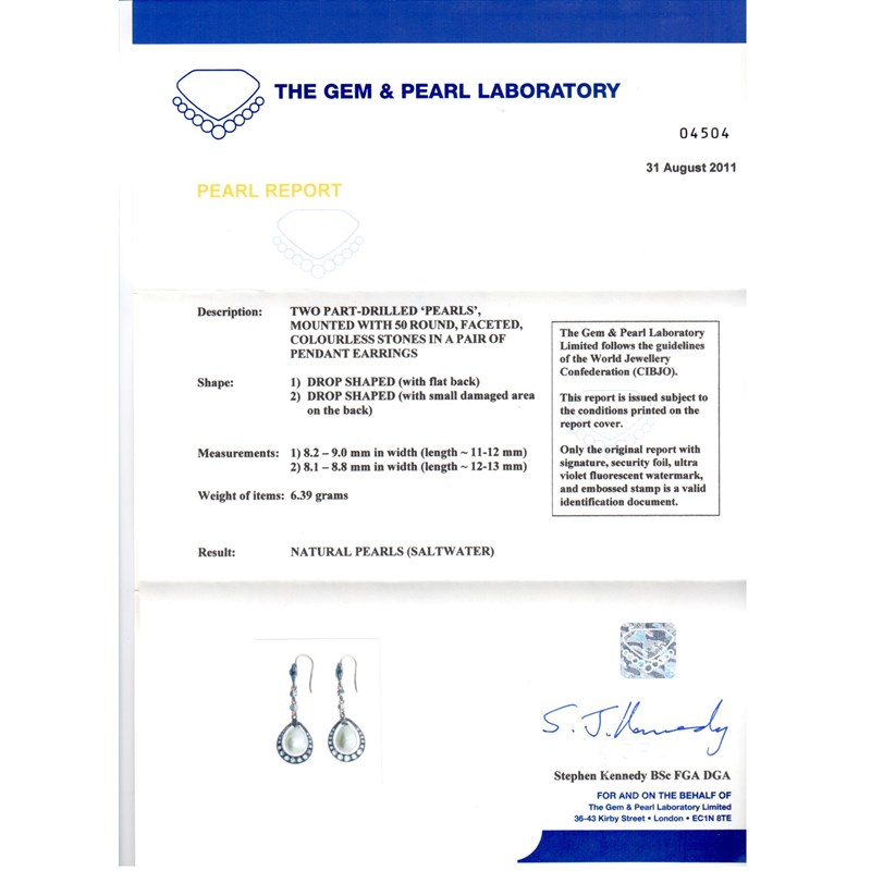 A pair of pearl and diamond drop earrings, each earring mounted with a drop shaped pearl within a border of graduated rose cut diamonds and suspending from a diamond set flower head with two smaller diamonds. Set in silver and gold. Fitted case. Accompanied with certificate number 94504 from The Gem and Pearl Laboratory dated 31st August 2011 stating that the two part-drilled pearls measure 8.2 x 9.0 x 11-12mm and 8.1 x 8.8 x 12-13mm. The earrings weigh 6.39g (total) and are natural saltwater pearls.