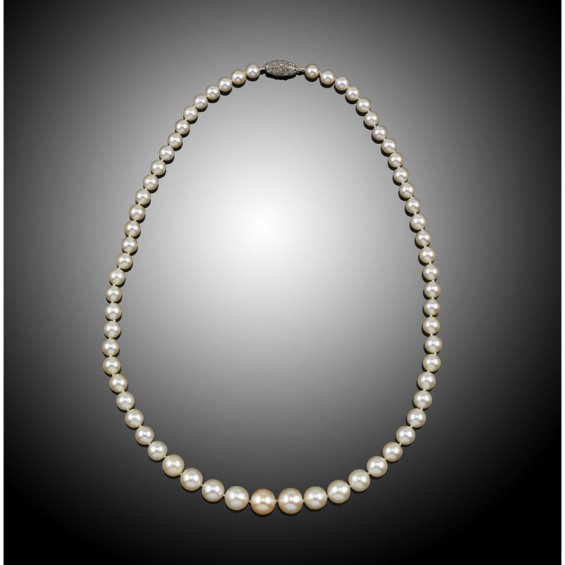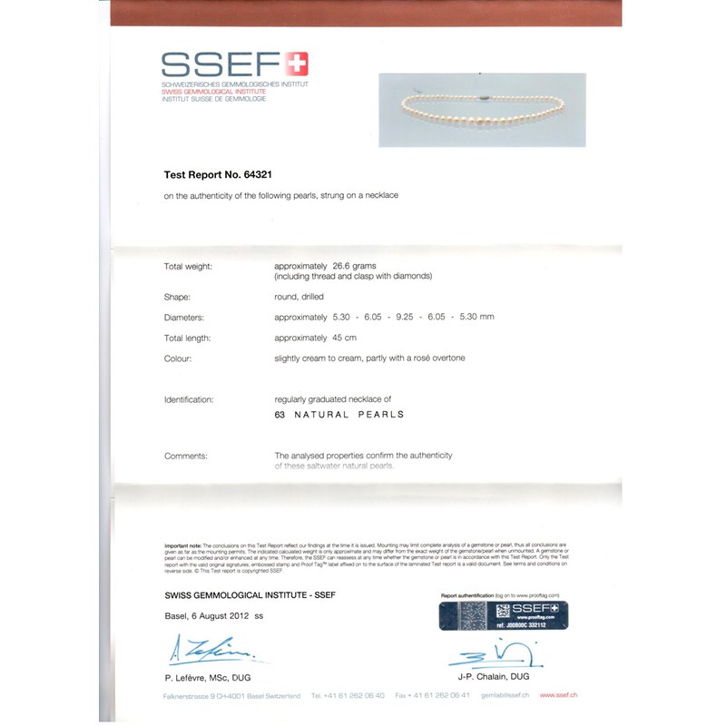 A fine pearl necklace, the single row graduated pearl necklace is 43cm with a simple barrel shaped clasp set with graduated rose cut diamonds. Accompanied with certificate number 64321 from SSEF dated 6th August 2012 stating that the 63 graduated pearls are natural saltwater with slightly cream to cream and partly rosé overtones. Total weight 26.6g (including clasp)