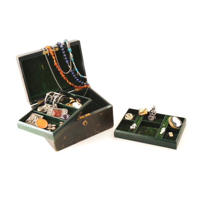 A green leather box, with two pull-out drawers retailed by Edwards & Sons, Regent Street and with Bramah lock, containing assorted jewellery