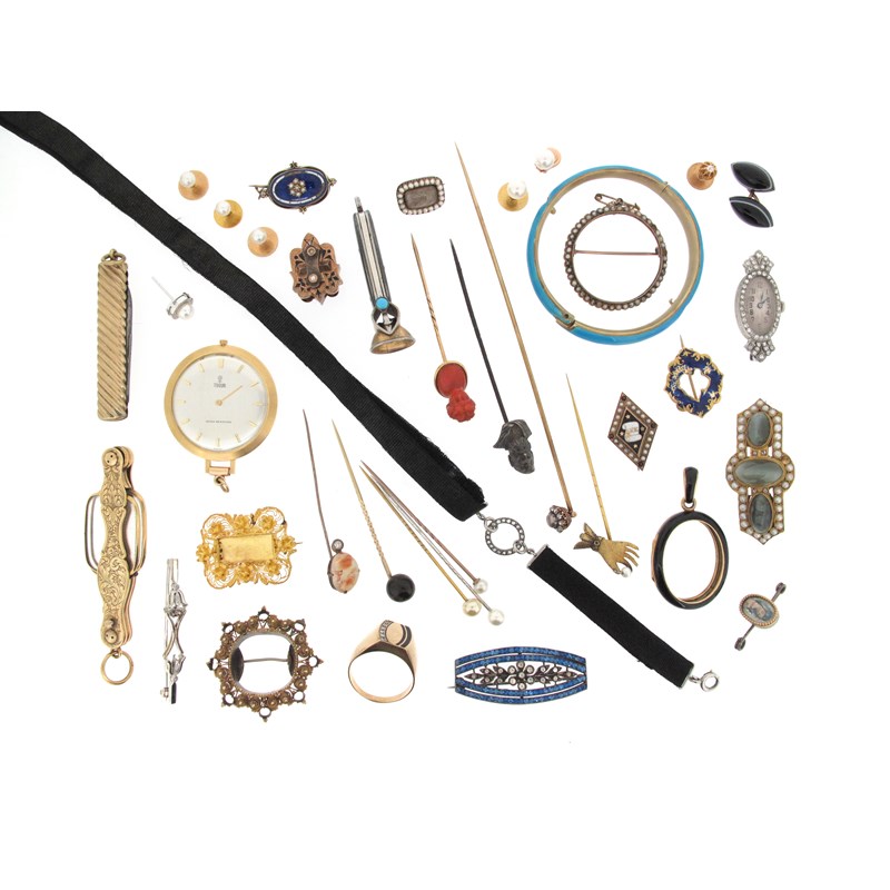Various items of jewellery, including a diamond-set white gold wristwatch, eleven assorted brooches, a gold slide, a blue enamel bangle and a black enamel pendant frame, a gold ring set with diamonds and with black enamel bands, an open-faced gold dress pocket watch by Tudor, a dress pen knife, a cigar cutter, six assorted studs, eight stick pins, a cufflink and a hat pin